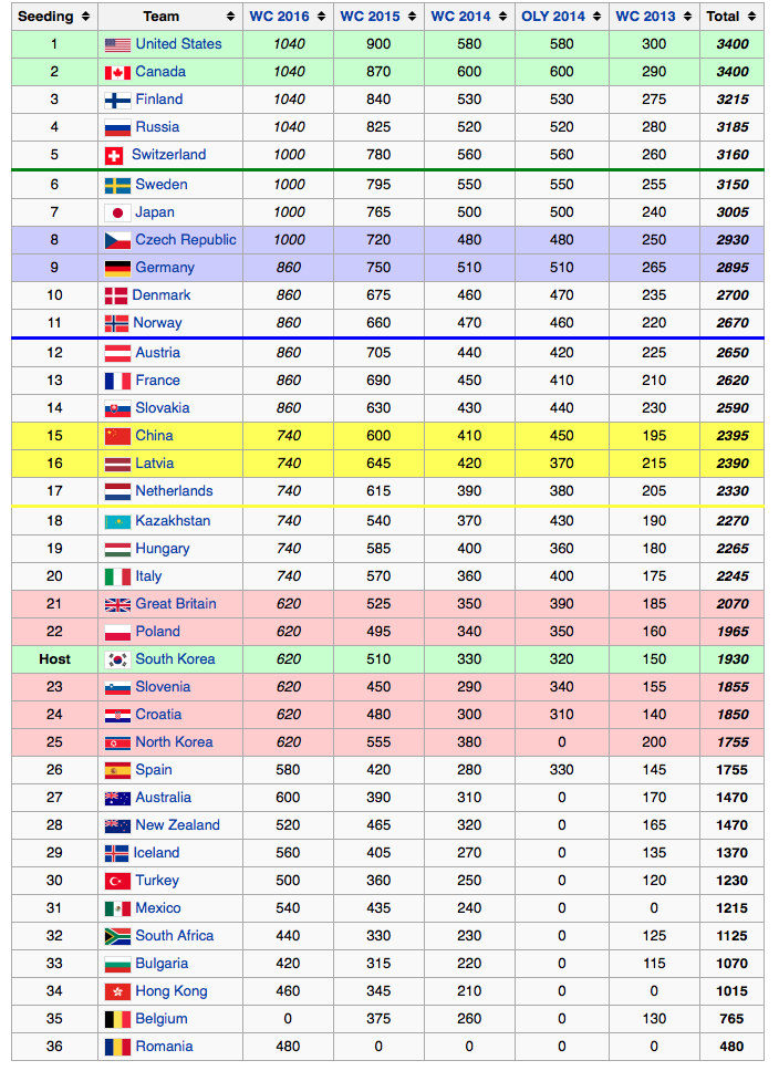 The 2016 Women's World Championships have direct ramifications for Olympic qualification. This detailed Wikipedia article explains the qualification process for Pyeongchang. Those countries that finish in the top 5 global rankings after the Kamloops tournament qualify directly for the 2018 Olympics. South Korea as the host nation is automatically qualified. An additional series of group tournaments determines who captures the remaining two spots.