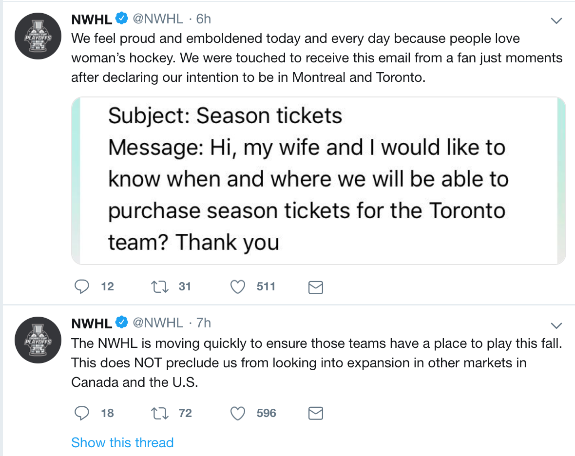 The NWHL announced today that our Board has approved investment in two Canadian markets. We expect to have teams in Toronto and Montreal this upcoming season and we’ll be pursuing opportunities to work with current stakeholders and partners. pic.twitter.com/iRCxLY51wI