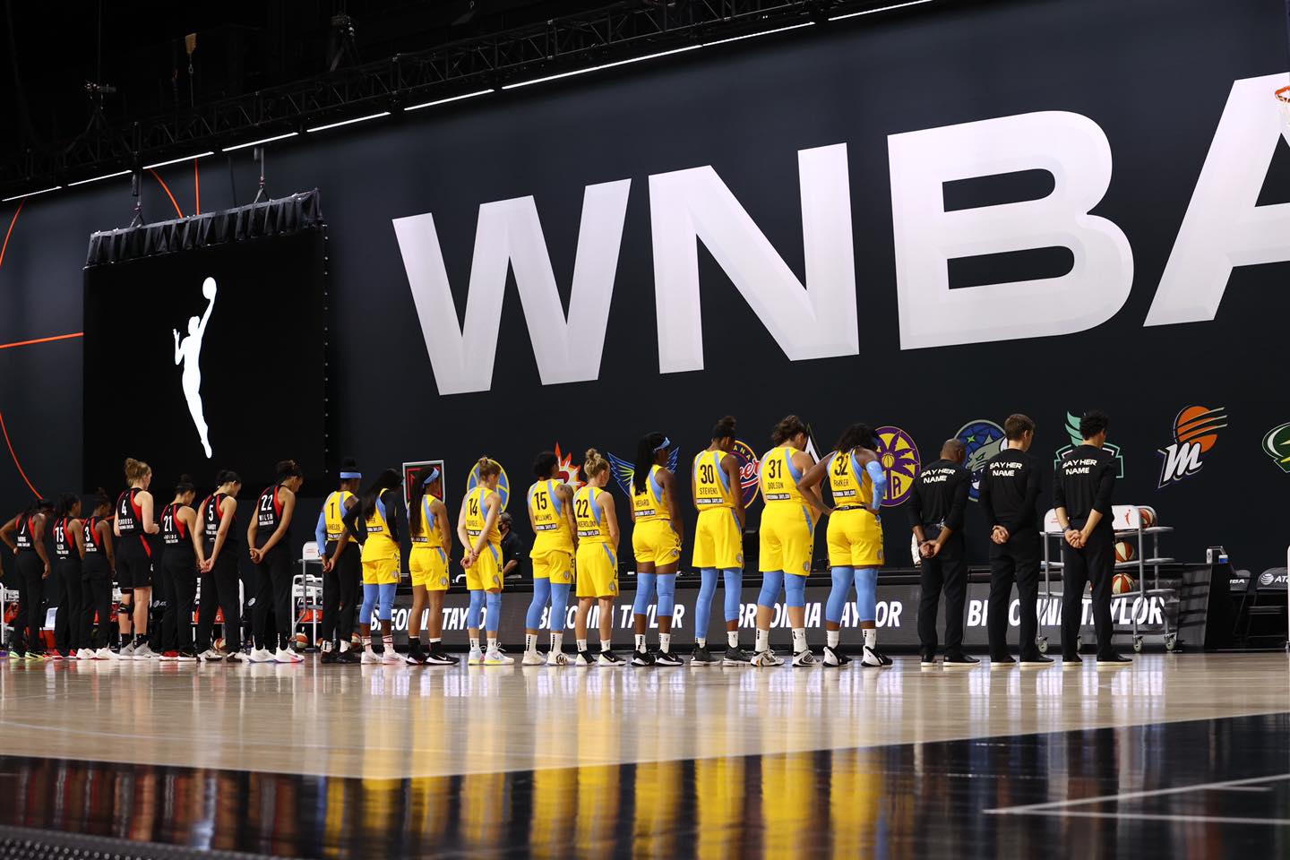 WNBA players want to raise awareness and seek justice for the women and girls who have been the forgotten victims of police brutality and racial violence. Players will individually have the choice to continue to wear the placard with Breonna Taylor's name for later games. Throughout the season, players will wear warm-up shirts that display "Black Lives Matter" on the front and "Say Her Name" on the back. "Black Lives Matter" is on courts during games. In the weekend opener, payers walked off the court during the singing of the national anthem and held a 26 second moment of silence for Breonna Taylor, the young woman killed by Louisville police while asleep in her home on March 13, 2020.