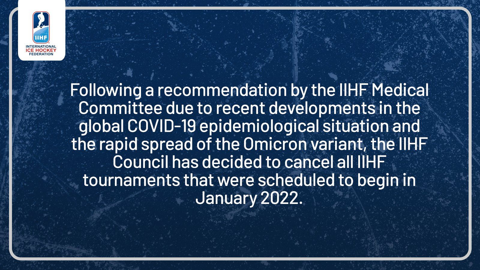 This cancellation affects six tournaments scheduled in January - two lower division men's U20 tournaments and four women's U18 tournaments. The World Juniors (Men's U20), scheduled to begin five days before January starts, is not affected.