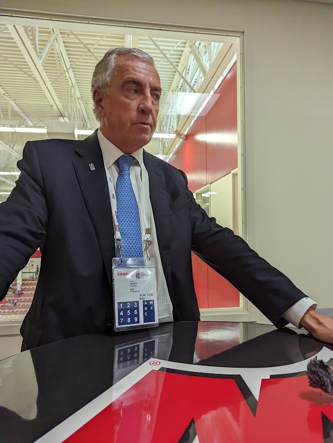 IIHF President Luc Tardif was made available to press for a short interview during intermission of the bronze medal game at the the U18 IIHF Women's World Championships in Madison on June 13.