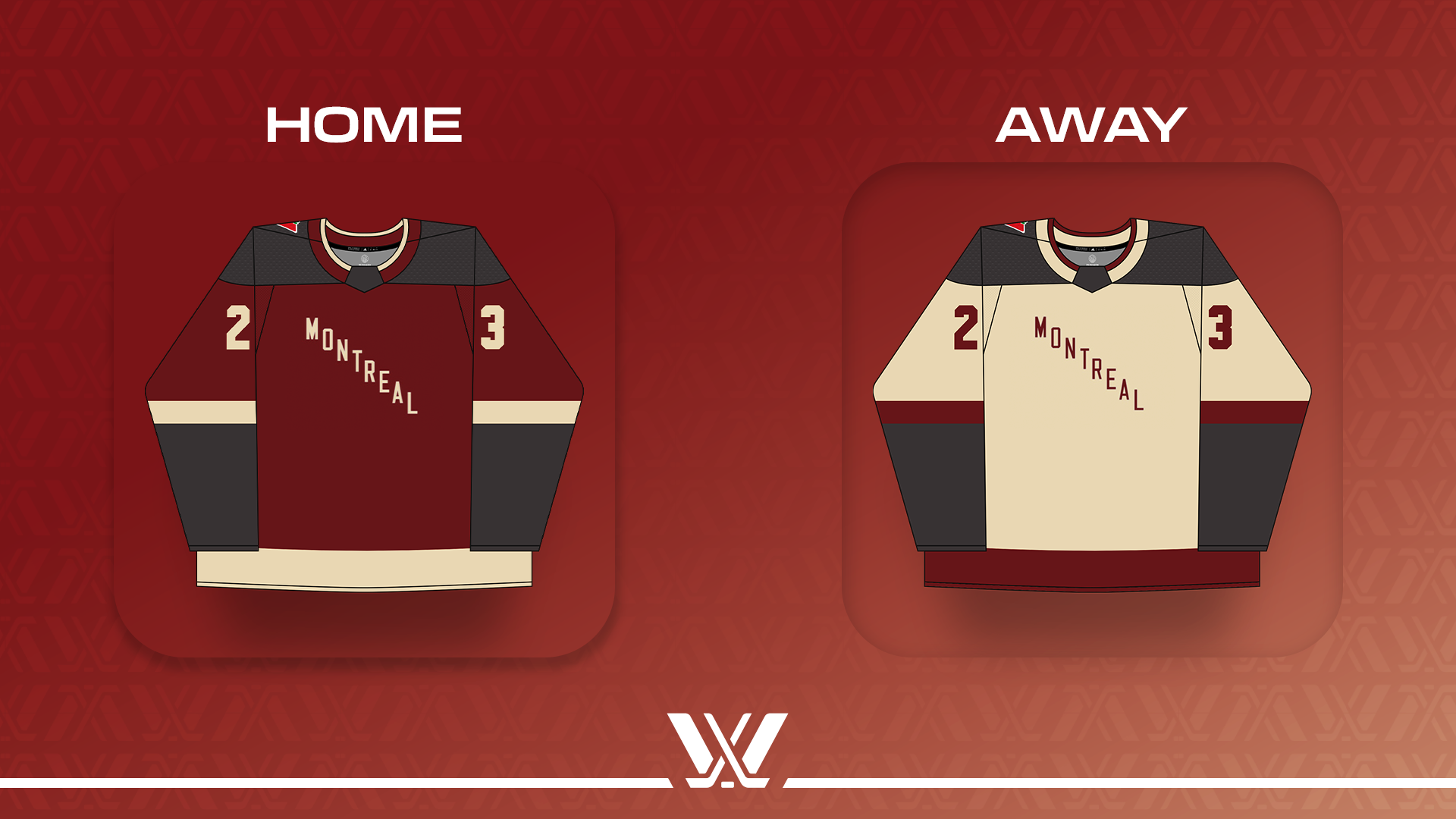 Montreal's jerseys were also revealed on November 15. The official team colors are Burgundy, Storm, and Sand. (As with Ottawa, the "storm" color is a dark blue-gray.)