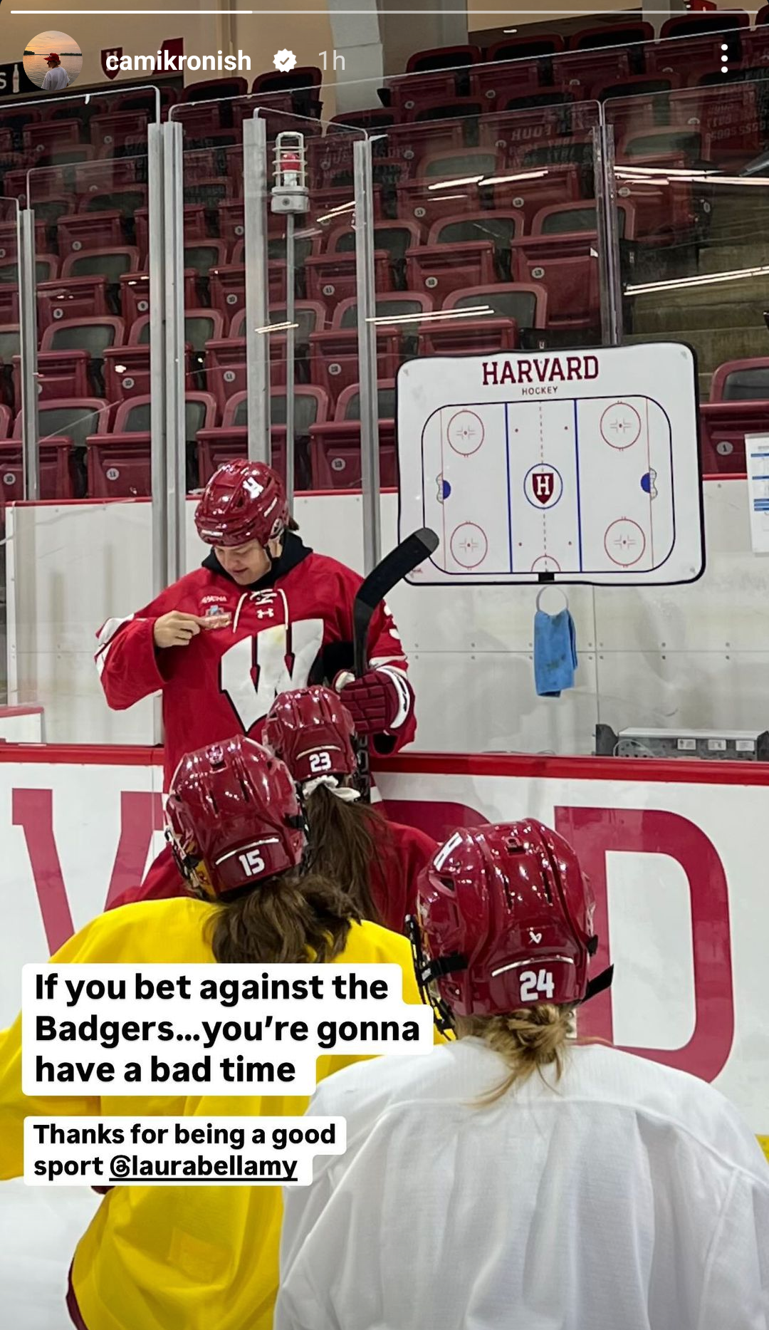 ↑ Woho Bets – Harvard goaltending coach and Wisconsin alumna Cami Kronish posted a picture on Instagram stories today of the Crimson's head coach and UMD alumna Laura Bellamy in Kronish's Badger jersey, complete with Frozen Four patch from Duluth. Kronish's Badgers swept Bellamy's Bulldogs last weekend.